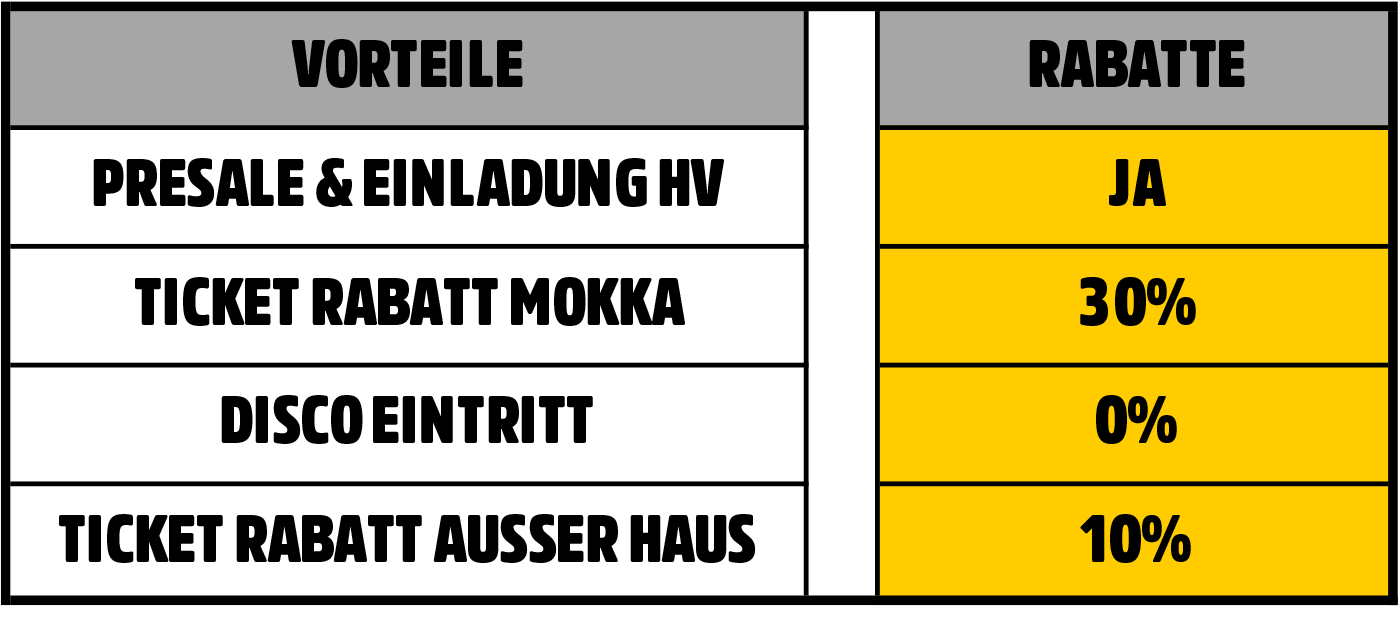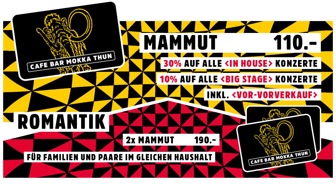 Du liebst Musik und Kultur? Dann ist die Mammut Card genau das Richtige für dich! Für 110 Franken erhältst du 30 % Rabatt auf fast alle Konzerte und Events des CAFE BAR MOKKA – und unterstützt gleichzeitig die Thuner Kulturszene. Die Mitgliedschaft im VEREIN MOKKA ist natürlich inklusive.