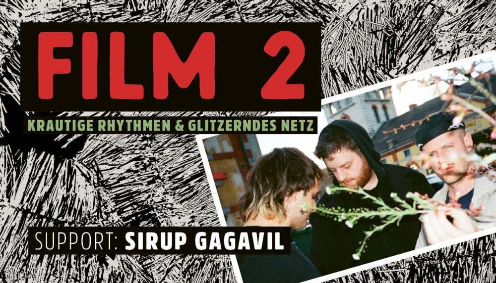 Der Nabel kann nicht warm sein, ohne zu ziehen. Dafür schnitzt Film 2 Ehrlichkeit aus den Knochen, das Flüchtige braucht Zeit, das Laute braucht die Stille. Wuchtige E-Gitarren paaren den Weltschmerz, krautige Rhythmen umarmen den Lärm, das Netz glitzert. Ihre Konzerte sind lebendig und ekstatisch, ebenso nervös wie einfühlsam, ein gemeinsames Ritual für Verletzlichkeit. Das Trio bläst Feuer in den Bauch und Nebel ins Gesicht, lässt Raum für Kontemplation und gibt Energie für die Trance. Film 2 ist Dämmerung in beide Richtungen, feucht, betrunken und schimmernd. Alles ist nichts und alles ist nichts.