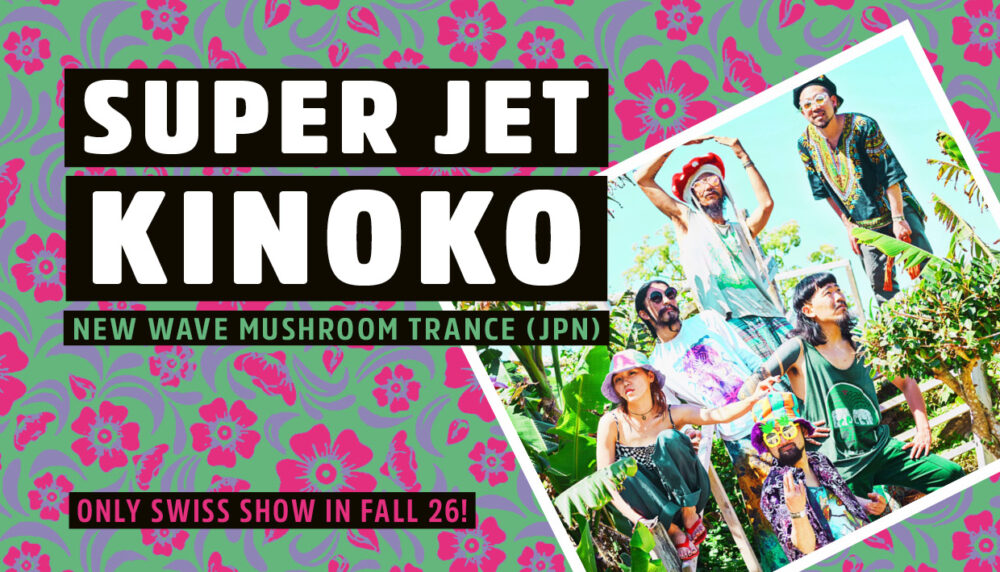 SUPER JET KINOKO ist eine New Wave Mushroom Trance Band aus Osaka, Japan. Diese rare, innovative Band trat wie ein Meteor auf die Szene und wurde schnell zu einem Phänomen im Party-Circuit. Ihre atemberaubenden Live-Shows umhüllen und verdrehen den Raum um sie herum, ein Ergebnis erfahrener Artists, die mit explosiver Energie zusammenkommen. Sie sind nicht von dieser Welt und ziehen sie dennoch ganz in ihren Bann. Euch erwartet eine Fusion aus Rock, Trance und psychedelischen Einflüssen, die den Geist von Festivals und spontaner Ausgelassenheit kanalisiert. Denkt an: extravagant, verrückt, wild und «Ee-ya-naika»-Energie. Aber wie immer gilt: Musik wird empfunden, nicht beschrieben.